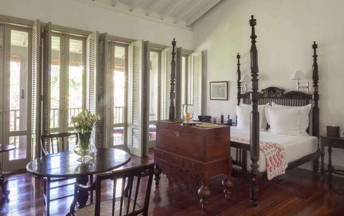 Kamer met jackwood-vloeren en elegant meubilair in koloniale stijl. Uitzicht op de 18e-eeuwse Groote Kerk van Galle (Grote Kerk), met kingsize bed of twee aparte bedden - Suite (80 m²):