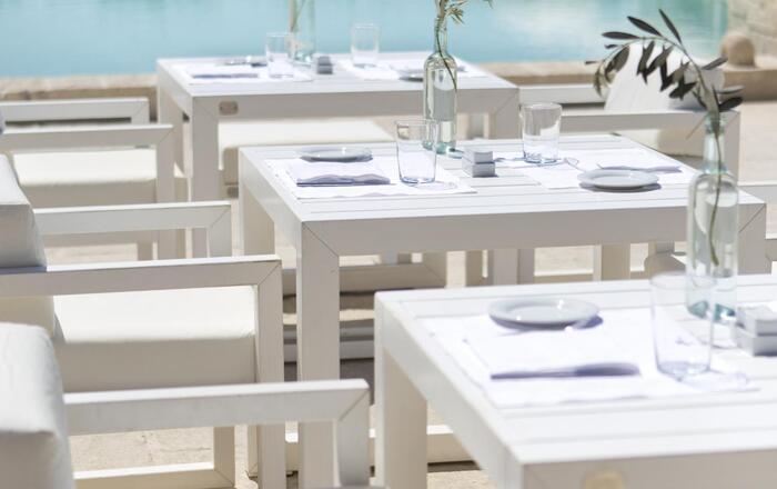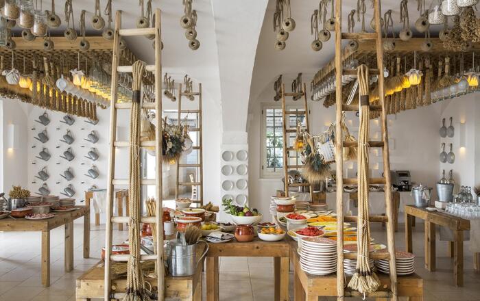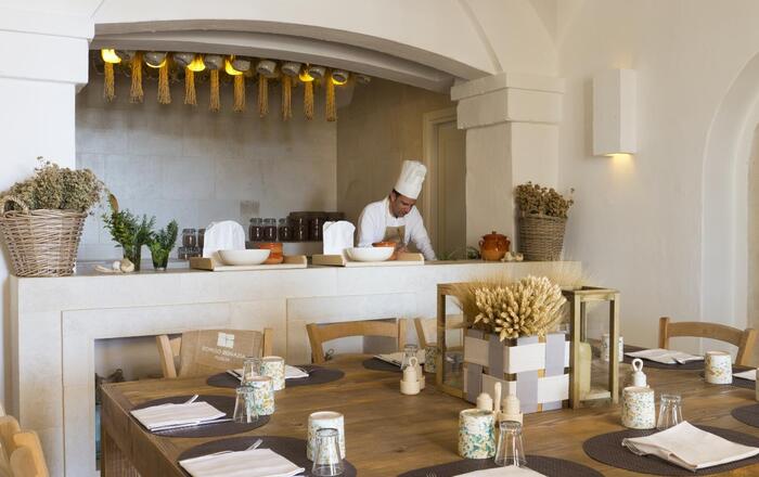 Ontbijtbuffet. A la carte restaurant 'Due Camini': verfijnd; 'La Frasca' (± 01/05-31/10): eenvoudiger; buffetrestaurant 'Il Cortile' (± 01/07-31/08): typische gerechten; 'Trattoria La Mia Cucina' (± 01/05-31/10): salades, pizza's en desserts; 'Cala Masciola' (± 01/06-30/09) aan het strand: à la carte visrestaurant. 'Da Frisella' (± 01/06-31/08): kinderrestaurant. Bij mooi weer kan overal buiten gegeten worden.