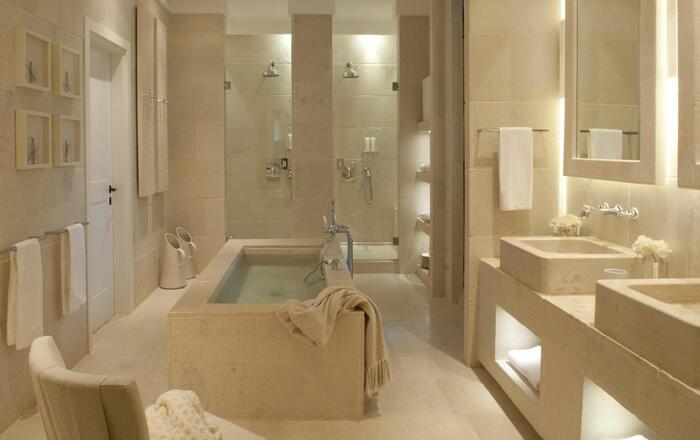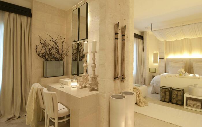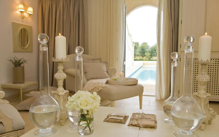 Kamers, in 'La Corte' (hoofdgebouw) en in de 'Borgo' (dorpje met huisjes en straatjes), met balkon, tegelvloer, airco, verwarming, tv, telefoon, safe, wifi, minibar, bad en douche + wc, haardroger, badjassen en slippers. Villa's met privézwembad op aanvraag. Kamertypes: