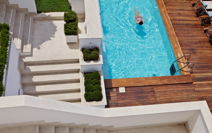 Casa Angelina staat voor pure klasse: een sublieme combinatie van een professionele service, een verfijnde keuken en een prachtig elegant designdecor met overwegend witte toetsen en subtiele details, met als achtergrond ... de zee die zich uitspreid als een azuurblauwe deken.