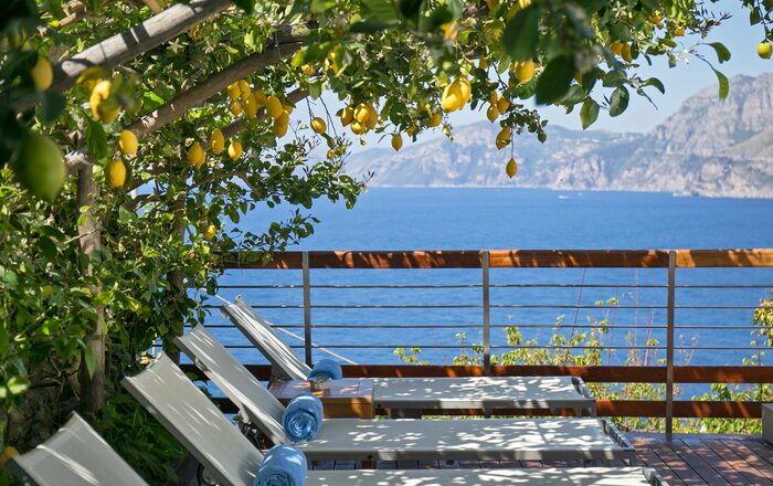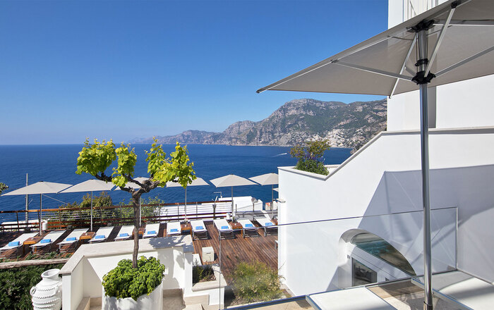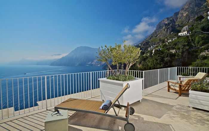 30 m² privéterras op de bovenste verdieping met zonnebedden, parasols, tafel en stoelen en met prachtig frontaal uitzicht op zee, Positano en Capri