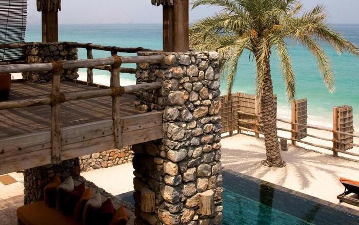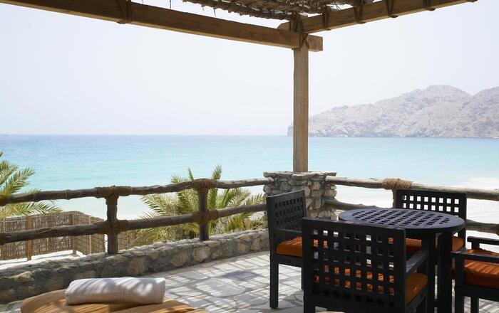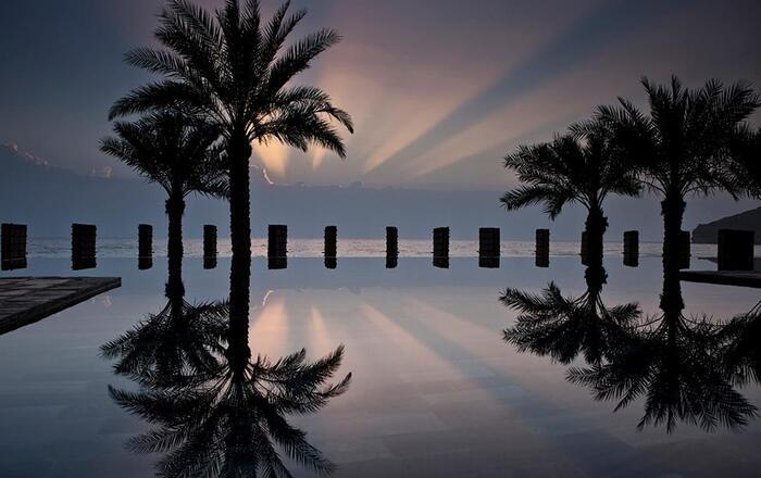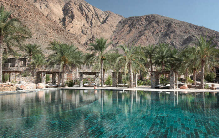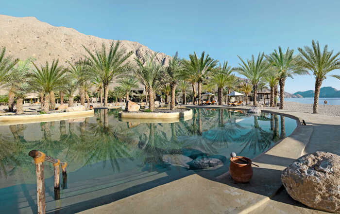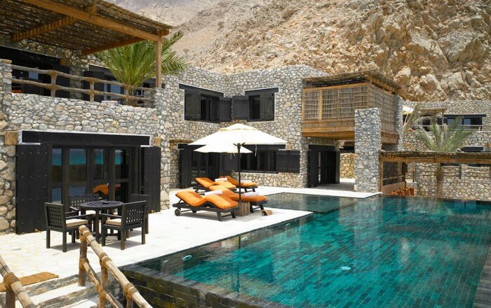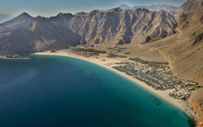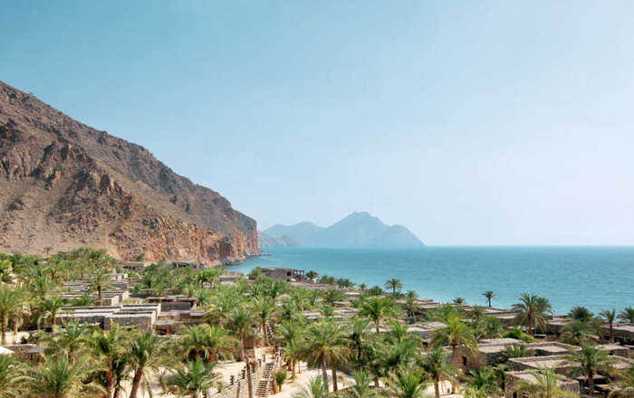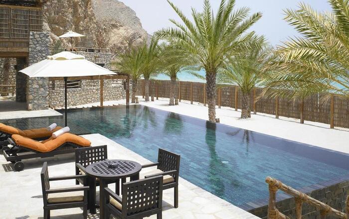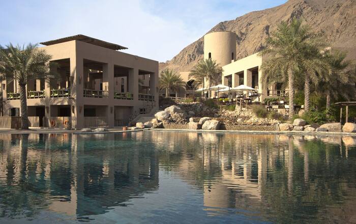 Deze ultra-luxueuze "verborgen schat" ligt in het noorden van Oman, op het prachtige Musandam schiereiland. Een werkelijk spectaculaire omgeving, met dramatische bergen op de achtergrond en vlak voor het hotel een uitgestrekt zandstrand van meer dan anderhalve kilometer lang. Het hotel ligt op een kleine 2 uur rijden van de luchthaven van Dubai, een wereld apart (Muscat in Oman ligt op bijna 5 uren rijden).