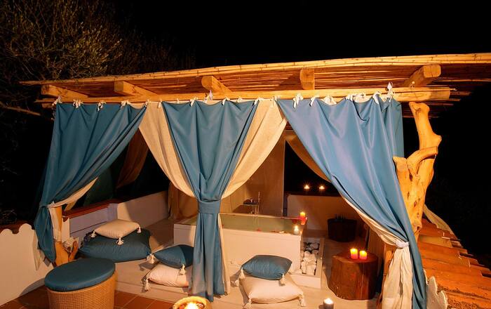De Wild Suite combineert de traditionele stijl met de mogelijkheid om de nacht buiten door te brengen, op het terras. Een intense beleving, in nauw contact met de natuur: u kunt kiezen voor een geurig kruidenbad en slapen onder de sterren...
