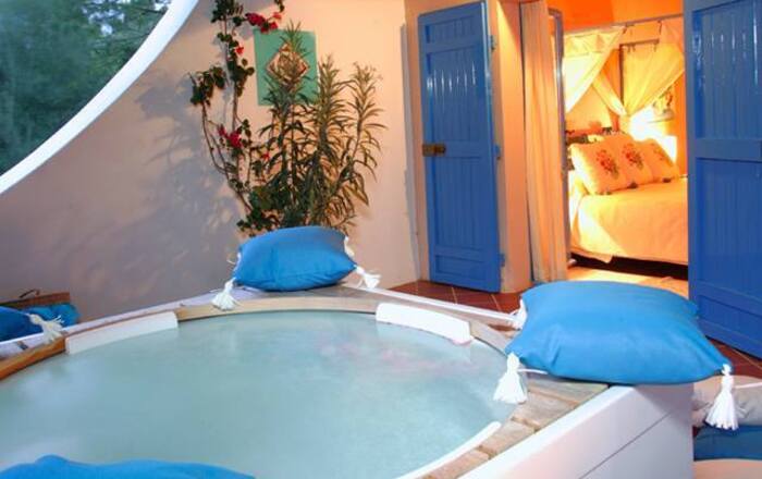 Deze suite bestaat uit twee aparte ruimtes: de grote slaapkamer en de woonkamer, met een open haard. De Country Suites kijken uit op de kruidentuin en hebben exclusief gebruik van een buitenlounge, met een eigen bad en hangmat, op een groot terras grenzend aan de betoverende tuin met orchideeën.