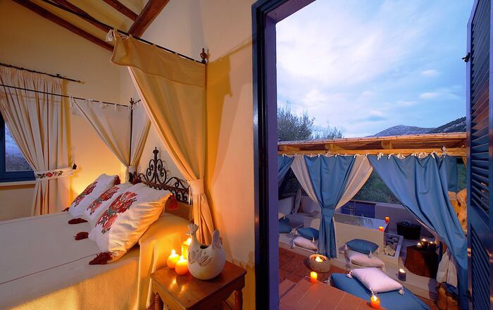 Sommige kamers hebben een ijzeren of een houten hemelbed, zoals gebruikelijk was in de lokale dorpen en ook een slaapbank en een grote badkamer met een douche. De meeste hebben een balkon of een terras.
