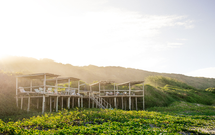 Elke hut bevindt zich op een verhoogd platform genesteld in een weelderige plantengroei op de golvende duinen. Natuurlijke materialen van vilt, riet en hout geven de heldere, minimalistische ruimtes een chique Robinson Crusoe gevoel. De hutten hebben glazen ramen over de volledige lengte om het frisse briesje en het geluid van de zee binnen te laten. Uw eigen houten terras strekt zich uit in het bos, waar u 's ochtends koffie kunt drinken te midden van fluitende vogels, of s’avonds cocktails onder een schitterende sterrenhemel.