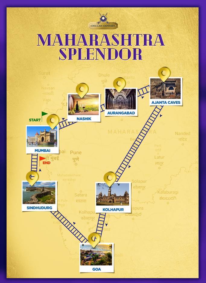 Welkom op een fascinerende reis aan boord van de Deccan Odyssey, een rit van 8 dagen door het achterland van Maharashtra, van de majestueuze West-Ghats naar de Deccan- en Konkan-regio's van een enorm en divers continent. Deze reisroute omvat bezoeken aan enkele van de meest prominente en onontdekte bestemmingen van west-centraal India, met een reis naar de heilige stad Nashik, nu ook de wijnhoofdstad van India; naar de ongeëvenaarde grotten van Ajanta en Ellora; de historische stad Kolhapur met zijn vele ervaringen, naar Goa, India's meest populaire vakantiebestemming; eindigend met een bezoek aan de heilige stad Sindhudurg. Tijdens een spoorwegreis als geen ander, in een land als geen ander, verwelkomen wij u aan boord van de Deccan Odyssey.